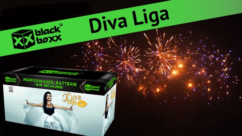 Performance Fächer-Batterie aus Goldflimmer-Chrysanthemen mit Purpur Dahlie und Goldflimmerschweifaufstieg, geschossen im Zick-Zack Fächer, gefolgt von einem Fächer aus Goldflimmerschweifkometen mit Verwandlung zu blauen Päonien in einer Goldflimmerwolke, danach wieder ein Zick-Zack Abschuss von Crossette-Kometen in Gelb und Purpur. Den Abschluss bildet ein Fächer aus großkalibrigen Goldpalmenbuketts in blauem Sternzentrum, kombiniert mit Titangold-Feuertöpfen und blauen Kometen.