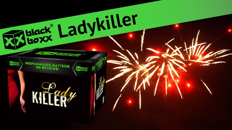 Performance Fächer-Batterie aus Titangold-Palmen mit silbernen Blinksternen und goldenem Palmenschweifaufstieg, gefolgt von einem V-Fächer aus Brokatschweifkometen mit Verwandlung zu Brokatkronen in Gold-Silber, danach eine Zick-Zack Kombination aus Titangoldkometen mit Verwandlung zu Titangold-Palmen mit silbernen Blinksternen und Brokatschweifkometen mit Verwandlung zu Brokatkronen in Gold-Silber. Den Abschluss bildet ein Fächer aus 3 großkalibrigen Brokatkronen-Buketts mit leuchtend roten Dahliensternen und Goldflimmer-Schweifkometenaufstieg.
